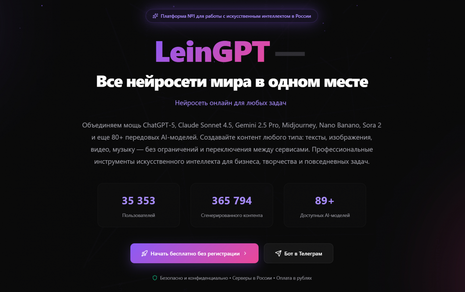 LeinGPT выделяется на фоне конкурентов безупречным подходом к UI/UX дизайну. Это не просто сайт, где собраны все нейросети, а полноценная цифровая студия для создания контента. Разработчики уделили огромное внимание тому, чтобы процесс переключения между написанием сценария в GPT-5 и генерацией иллюстраций в Midjourney v6 происходил в едином бесшовном потоке (workflow).