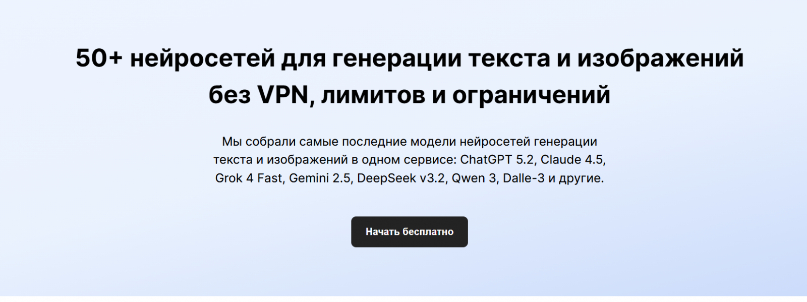 К 2026 году концепция цифрового потребления изменилась: оформлять раздельные дорогостоящие подписки на продукты OpenAI, Anthropic, Google и Midjourney стало экономически нецелесообразно. Намного выгоднее использовать единый агрегатор нейросетей в России. Такие хабы объединяют вычислительные мощности Claude 4.6, Gemini 3.0 и новейших видеогенераторов на одной платформе. Это не только оптимизирует ваши затраты, но и дает существенные преимущества: большинство сервисов из нашего рейтинга начисляют welcome-бонусы и бесплатные токены при регистрации. Вы можете протестировать топовые нейросети без вложений. Отныне все нейросети в одном сервисе открывают бесшовный доступ к технологиям искусственного интеллекта — без сложных настроек, русифицировано и по цене одной базовой подписки.
