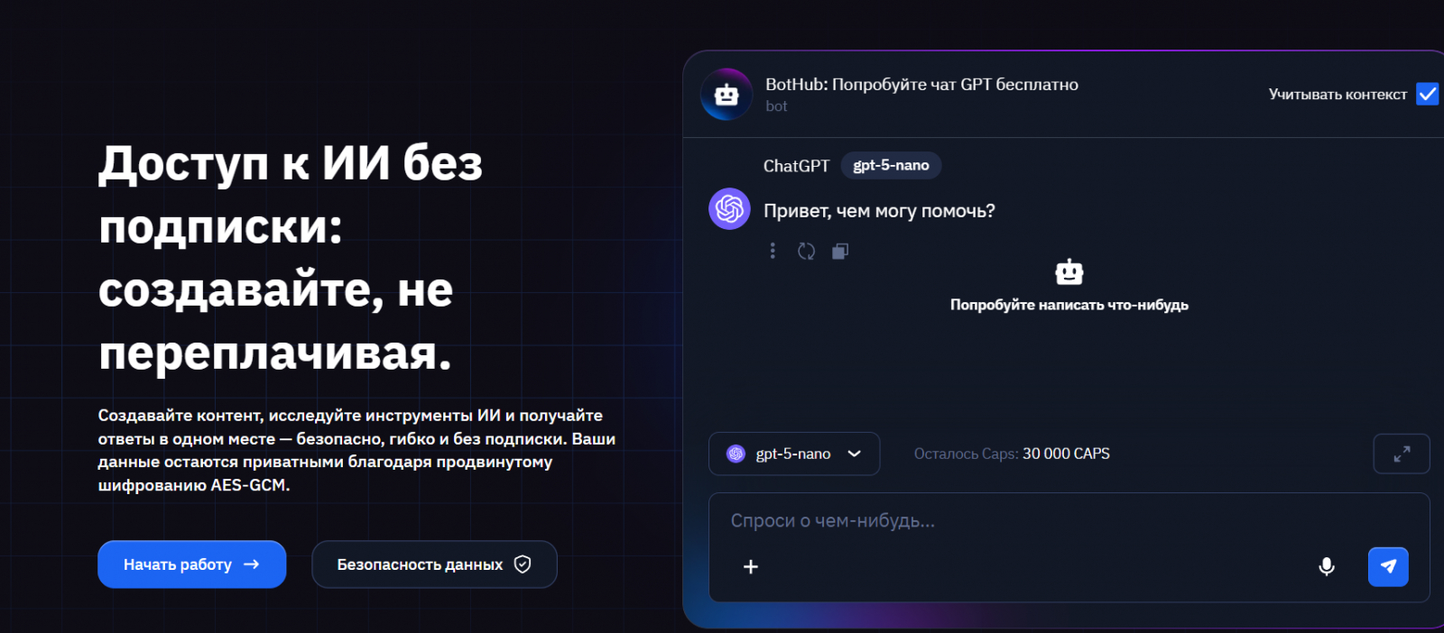 Bothub прочно закрепился в статусе надежного решения, входящего в топ агрегаторов ИИ для совместной работы. Архитектура сервиса продумана до мелочей: гибкие лимиты, распределение ролей в команде, API-интеграции. Если вам требуется организовать доступ к нейросетям для целого штата сотрудников, Bothub закроет эту потребность на 100%.