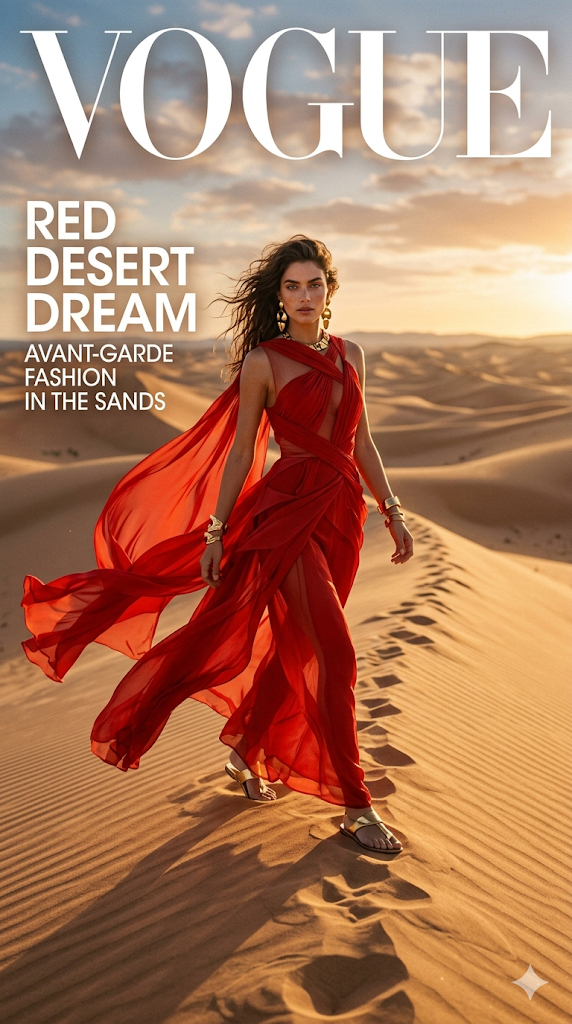 [Загрузите фото-референс позы/одежды] Fashion editorial photography, full body shot of a high-fashion model wearing an avant-garde flowing red silk dress. Setting is a vast desert with rolling sand dunes. Golden hour lighting casting long, dramatic shadows. Wind blowing the fabric gracefully. Shot on 35mm lens, Kodak Portra 400 film aesthetic, film grain, hyper-realistic, Vogue magazine cover style, sharp focus on the face, perfect anatomy.