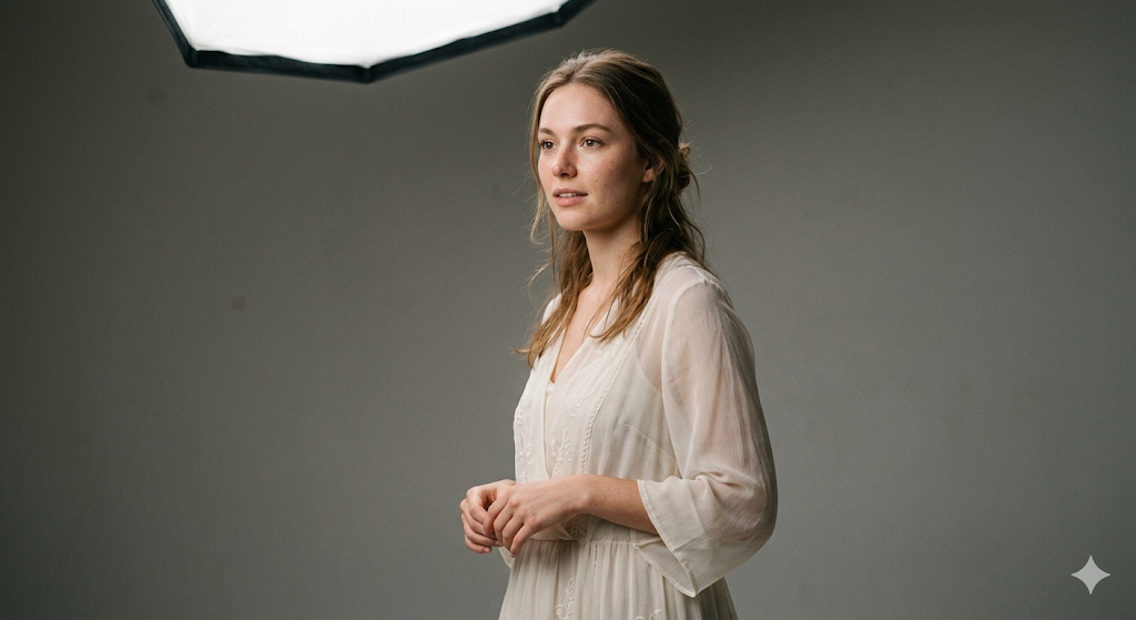 - Женский портрет 1: Используя прикрепленное фото как референс лица. Студийная фэшн-съемка, молодая женщина в легком полупрозрачном платье. Мягкий рассеянный свет от софтбокса, нейтральный серый фон. Снято на объектив 85mm, диафрагма f/1.8. Максимальная детализация текстуры ткани и пор кожи, естественный макияж, абсолютный фотореализм.