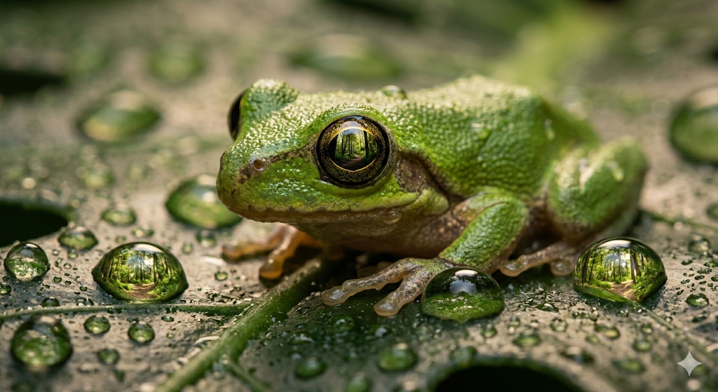 - Макро фотография: Экстремально крупный план маленькой зеленой древесной лягушки, сидящей на влажном листе монстеры. Капли росы работают как крошечные линзы, отражая утренний лес. Макрообъектив 100mm, кольцевая вспышка, невероятная детализация чешуек и влажной кожи, фокус точно на глазу животного.