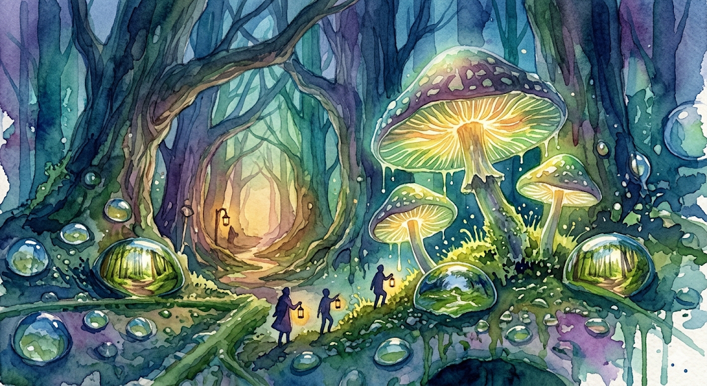- Арт 3: Концептуальный арт сказочного леса в технике акварельной живописи. Полупрозрачные мазки, случайные потеки краски, слоистая перспектива. Огромные светящиеся грибы и маленькие силуэты путешественников с фонарями. Глубокие синие, изумрудные и фиолетовые оттенки, волшебная атмосфера.