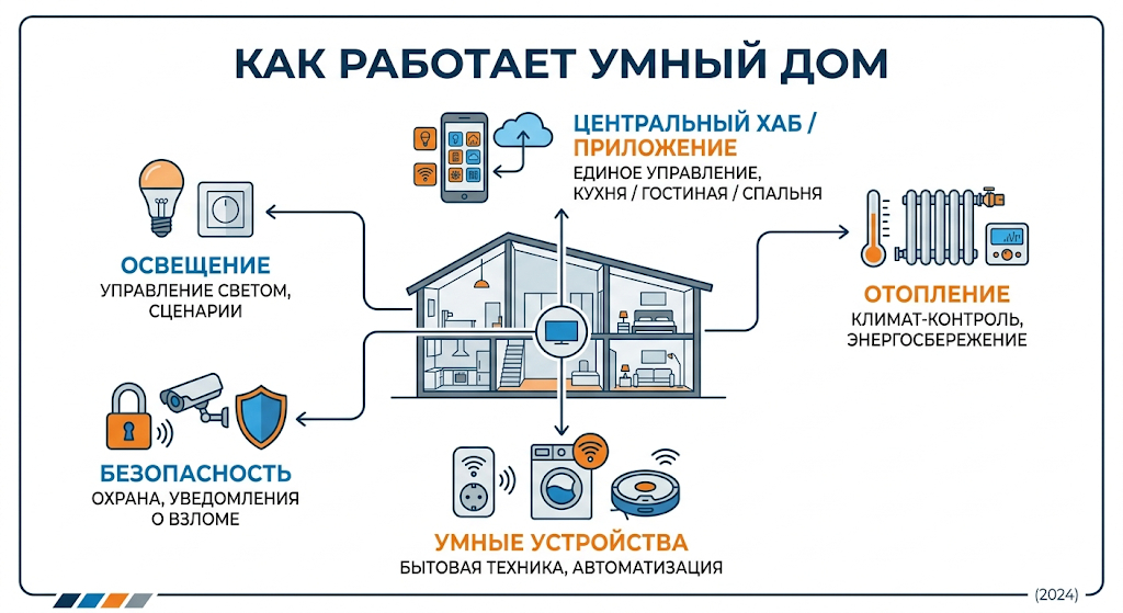 - Схема: Понятная инфографика на тему "Как работает умный дом". В центре расположен стилизованный дом в разрезе, от него идут аккуратные линии к иконкам: "Освещение", "Отопление", "Безопасность". Текст крупный, четкий, без опечаток. Цветовая гамма: чистый белый фон, синие и оранжевые акценты, современный корпоративный стиль.