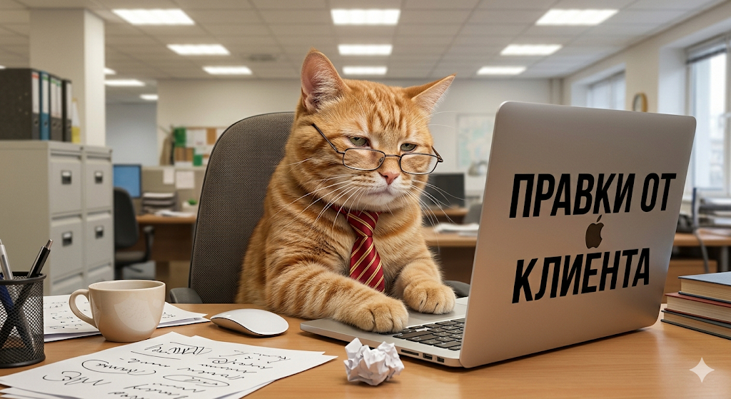 - Мем 1: Фотореалистичный уставший рыжий кот сидит за офисным столом перед ноутбуком. На коте надеты маленькие очки для чтения и галстук. Он смотрит в экран с выражением полного отчаяния. На экране ноутбука крупными буквами написано "ПРАВКИ ОТ КЛИЕНТА". Офисное освещение, забавный сюжет.