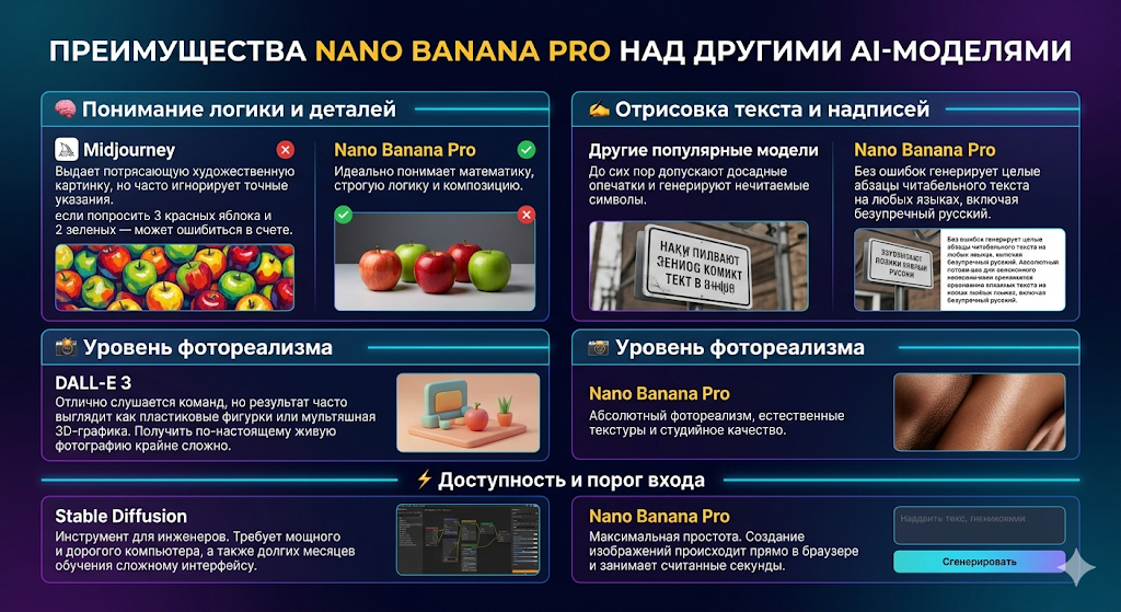 - Nano Banana Pro: Без ошибок генерирует целые абзацы читабельного текста на любых языках, включая безупречный русский.
