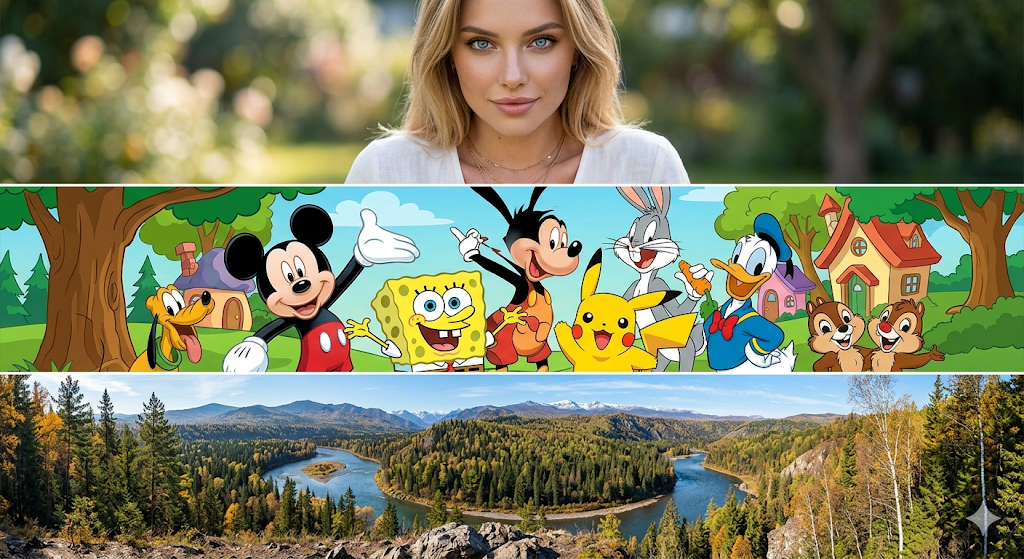 - Сложная верстка прямо в промпте: Модель отлично понимает структуру кадра. Можно задать жесткие рамки: например, сделать широкое изображение 16:9, где слева будет фото в низком разрешении, а справа — его улучшенная копия для демонстрации эффекта «До/После».