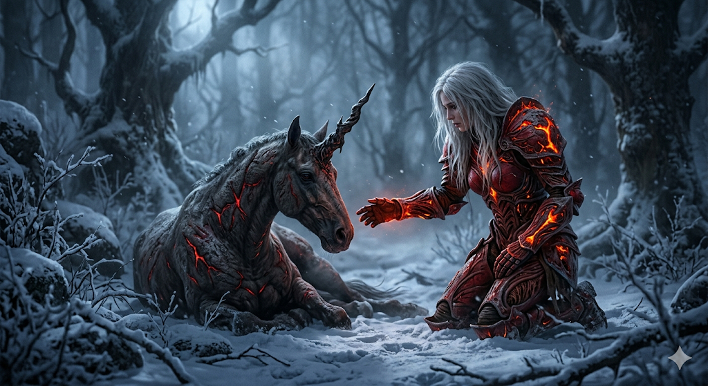Скопируй внешность лица с загруженного референсного фото и примени к девушке с длинными распущенными белыми волосами, одетой в багровую биомеханическую броню с текстурой органических волокон и трещинами, заполненными раскаленной лавой. Она преклонила колено на заснеженную землю и протягивает руку к раненому единорогу с искаженным рогом и светящимися красными разломами на грубой коже. Действие происходит в мистическом зимнем лесу во время мягкого снегопада, где холодный синий туман обволакивает стволы старых деревьев. Атмосфера темного готического фэнтези передает трагичное и магическое настроение. Ультрареализм: персонаж, животное, лес - каждый объект максимально кинематографичен. Объемное кинематографическое освещение смешивает холодный свет луны с теплым красным свечением от брони, снято на портретный объектив с малой глубиной резкости для сильного размытия заднего фона. 8k resolution, cinematic lighting, shallow depth of field, 85mm lens, f/1.4, highly detailed textures, volumetric fog, masterpiece.