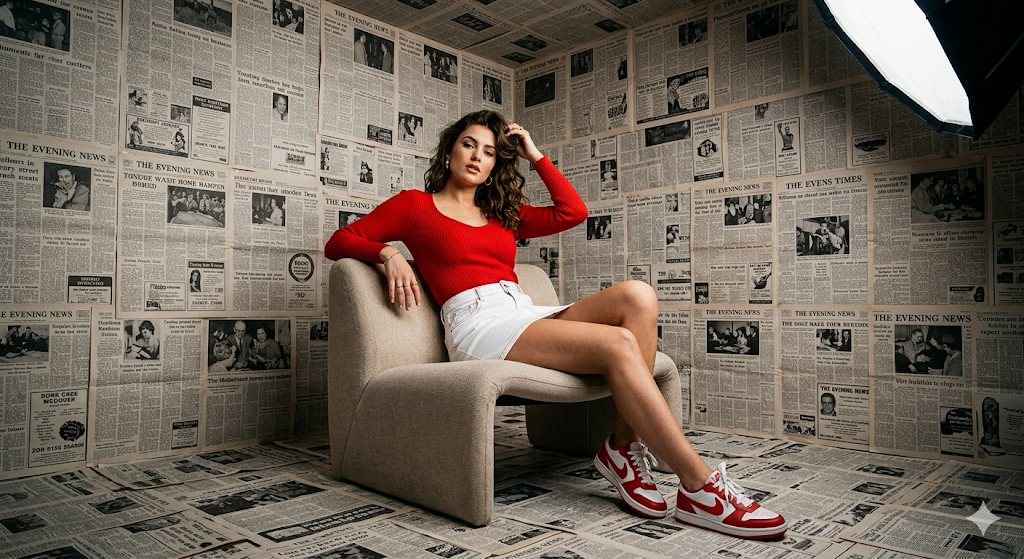 Скопируй внешность лица с загруженного референсного фото и примени к стильной женщине в облегающем красном топе, белой мини-юбке и красно-белых кроссовках. Она уверенно сидит на современном бежевом кресле, расслабленно касаясь рукой своих волос. Пространство представляет собой кубическую комнату, стены, пол и потолок которой полностью оклеены винтажными черно-белыми газетами. Ультрареалистичная фэшн-фотография передает дерзкий и концептуальный журнальный стиль. Студийное кинематографическое освещение создает резкие тени и выделяет текстуру газетной бумаги, камера обеспечивает максимальную резкость и детализацию каждого элемента в кадре. ultra-realistic fashion photography, cinematic studio lighting, sharp focus, 8k detail, 35mm lens, high contrast, editorial look, highly detailed textures.