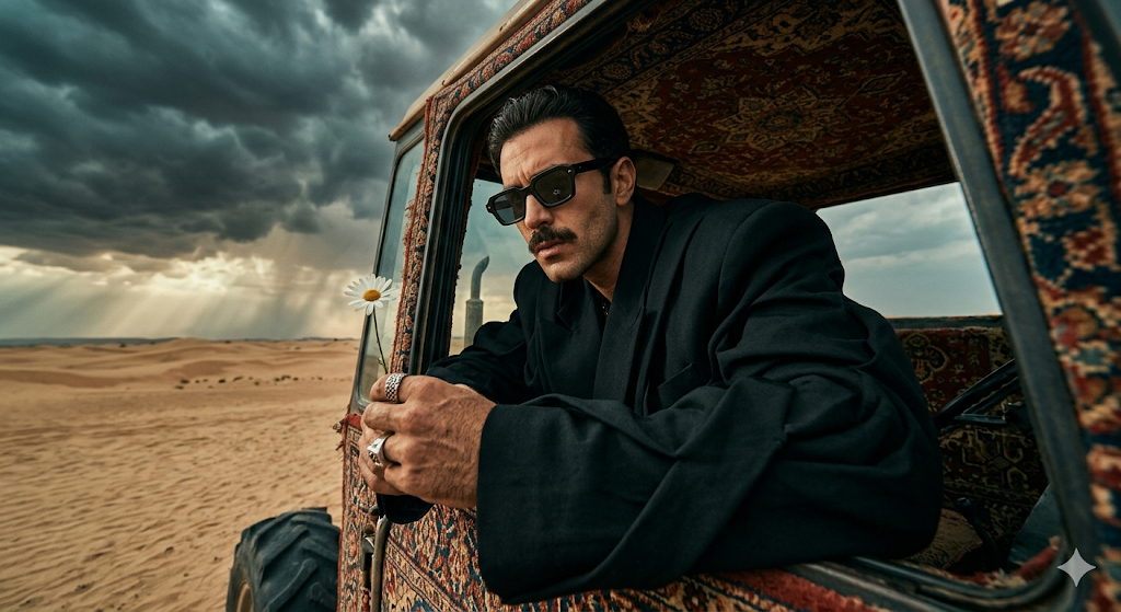 Скопируй внешность лица с загруженного референсного фото и примени к мужчине в объемном черном пиджаке со складками и прямоугольных солнцезащитных очках. Он сидит внутри кабины трактора, полностью обитой фактурным ковром, высовывается из бокового окна и держит в руке хрупкий белый полевой цветок. Трактор припаркован посреди бескрайней безжизненной пустыни, уходящей за горизонт под тяжелым грозовым небом. Стиль эпичного журнального кадра сочетает сюрреализм и высокую моду. Рассеянный свет пробивается сквозь тучи, создавая приглушенную кинематографичную палитру с оттенками бирюзового и оранжевого, камера берет экстремально крупный план снизу с искаженной перспективой и объемными лучами света. IMAX-style realism, blockbuster photography, medium format Hasselblad, 100mm f/2.8 lens, dramatic low angle, cinematic depth of field, teal and orange grading, 8k resolution.