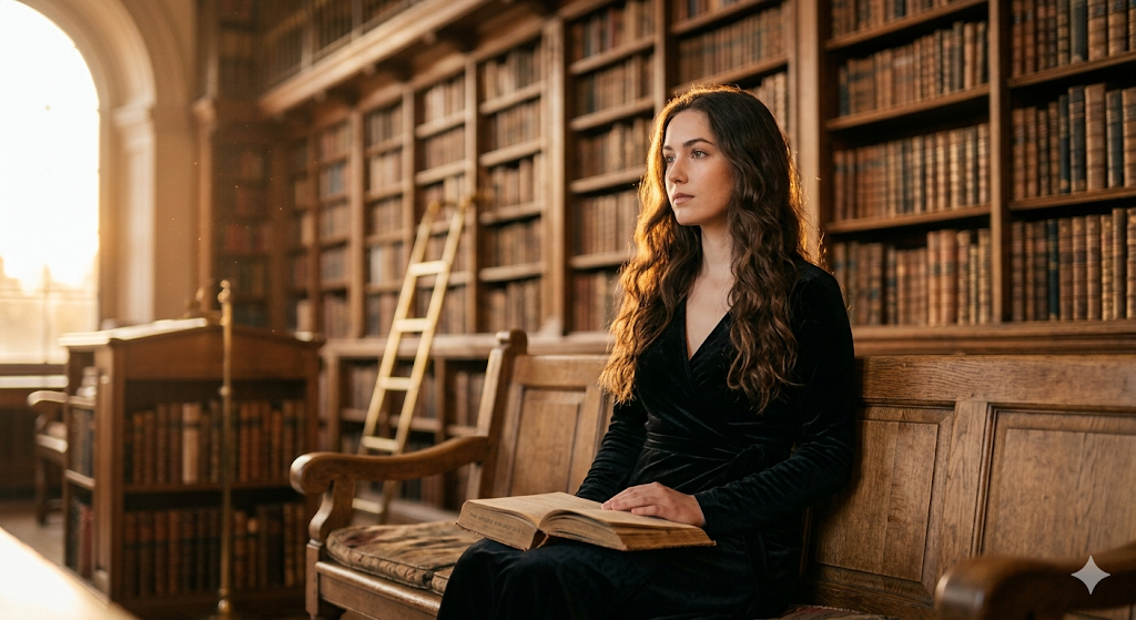Скопируй внешность лица с загруженного референсного фото и примени к девушке с длинными волнистыми волосами, одетой в элегантное черное бархатное платье с запахом. Она сидит на массивной деревянной скамье, держа на коленях открытую книгу в твердом переплете, и задумчиво смотрит в сторону невидимого окна. Окружение представляет собой величественную старинную библиотеку с высокими стеллажами от пола до потолка, плотно уставленными книгами. Атмосфера тихой академической меланхолии дополняется мягким золотистым светом закатного солнца, пробивающимся сквозь окно. Контровое освещение создает яркий контур на ее волосах, в воздухе видна парящая пыль, снято с мягким бликом объектива и сильным размытием заднего плана. photorealistic portrait, warm golden hour, rim lighting, atmospheric dust motes, 85mm lens, f/1.8, shallow depth of field, cinematic color grading.