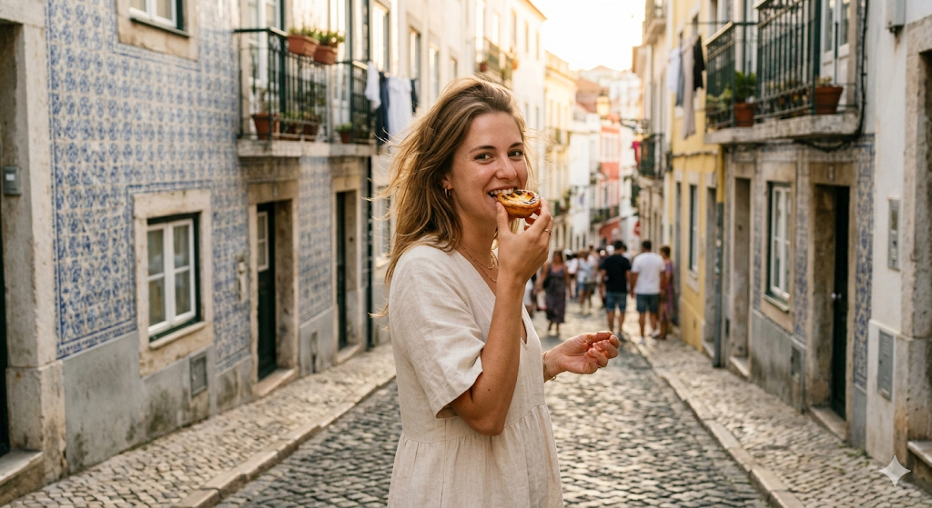 Скопируй внешность лица с загруженного референсного фото и примени к молодой женщине в легком льняном платье кремового цвета со слегка растрепанными на ветру волосами. Она откусывает традиционный португальский десерт паштел-де-ната, держа его в одной руке и уверенно глядя прямо перед собой. Героиня находится на узкой мощеной улочке Лиссабона, окруженной историческими зданиями с фактурной плиткой азулежу на стенах. Эстетика естественной лайфстайл-фотографии для социальных сетей передает беззаботное настроение европейского лета. Сцена залита теплым естественным солнечным светом золотого часа с мягкими тенями, снято на камеру смартфона с реалистичной цветопередачей, сохранением натуральной текстуры кожи и легким оптическим искажением объектива. smartphone photography, lifestyle aesthetic, natural golden hour sunlight, raw skin texture, 24mm lens, authentic dynamic range, no beauty filter, photorealistic.