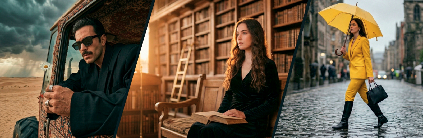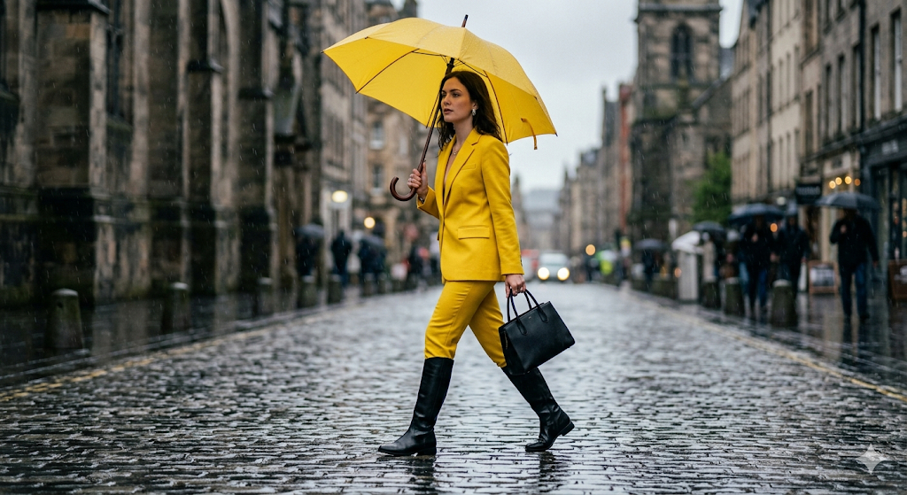 Скопируй внешность лица с загруженного референсного фото и примени к женщине в строгом ярко-желтом брючном костюме, черных кожаных сапогах до колен и с классической черной сумкой в руке. Она грациозно шагает по мокрой брусчатке, держа над собой плотный желтый зонт с деревянной изогнутой ручкой и задумчиво глядя в сторону. Локация представляет собой улицу с размытыми контурами каменной архитектуры под проливным дождем в пасмурный день. Стиль кинематографичной модной редакции выделяется контрастом яркой одежды и приглушенного серого окружения. Рассеянный дневной свет подчеркивает текстуру мокрого асфальта и капли на зонте, камера фокусируется на объекте на уровне глаз с легким эффектом смазывания падающих капель. cinematic art-fashion editorial, overcast rainy daylight, moody contrast, 50mm prime lens, f/2.0 aperture, sharp focus, rain reflections, highly detailed.