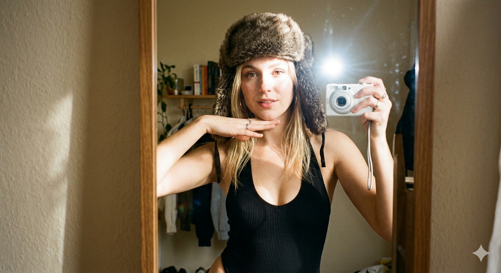 Скопируй внешность лица с загруженного референсного фото и примени к девушке со светлыми прямыми волосами, одетой в черное боди с глубоким вырезом и массивную пушистую шапку-ушанку из темно-коричневого искусственного меха. Она делает селфи в зеркало, держа белую компактную цифровую камеру в левой руке, а правой рукой изящно обрамляя подбородок. Фоном служит нейтральная бежевая стена с легкими тенями от фигуры. Эстетика нулевых годов передает атмосферу любительской цифровой съемки для социальных сетей. Жесткий прямой свет от встроенной вспышки создает пересветы, яркий блик на объективе и резкие контуры, имитируя винтажную цифровую фотографию с грубой текстурой. Y2K aesthetic, vintage digital camera vibe, harsh direct flash, lens flare, candid social media style, high contrast, overexposed highlights, flash photography.