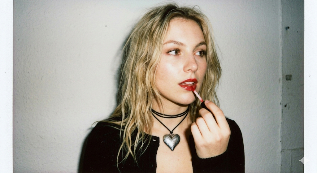 Скопируй внешность лица с загруженного референсного фото и примени к девушке в черном облегающем топе с открытой шеей и тонком черном чокере с массивным кулоном-сердцем. Она чувственно наносит красный блеск на губы, слегка отведя взгляд в сторону от камеры. Сцена снята на фоне минималистичной светлой стены без лишних деталей. Стиль винтажного полароидного снимка из девяностых годов подчеркивает гранжевую и смелую моду того времени. Съемка со вспышкой в лоб создает жесткие тени на стене, легкий пересвет кожи и высокую контрастность, картинка дополнена выраженным пленочным зерном для аутентичности. 90s editorial fashion, vintage polaroid texture, direct flash, high contrast, harsh shadows, slightly overexposed, visible film grain, close-up portrait.