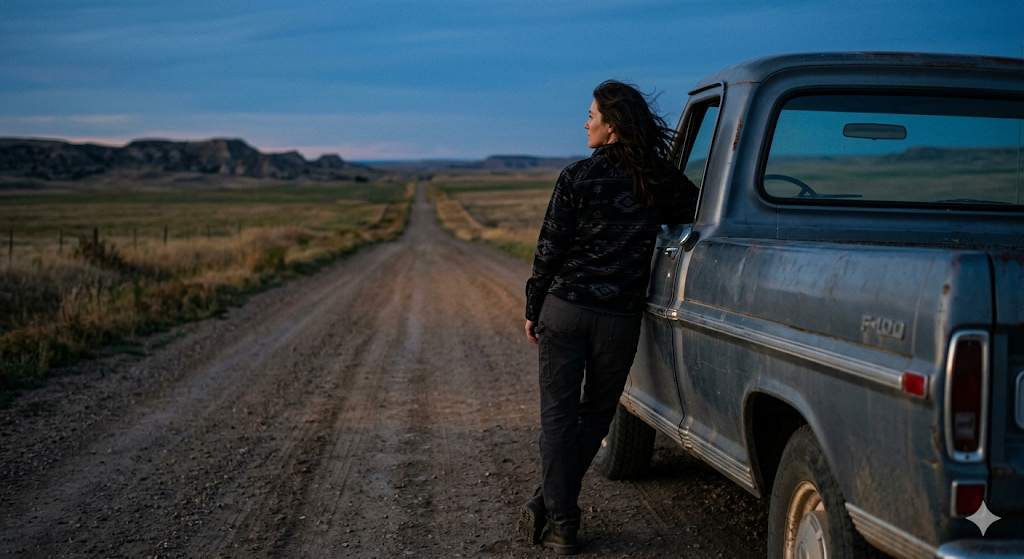 Скопируй внешность лица с загруженного референсного фото и примени к женщине в черной рубашке с геометрическим узором. Она стоит, прислонившись к металлическому кузову автомобиля на пустынной проселочной дороге, окруженной открытыми полями и далекими холмами. Эстетика профессионального кинематографического кадра передает атмосферу роуд-муви и вечернего спокойствия. Естественное освещение синего часа создает мягкие градиенты на небе, реалистичные приглушенные цвета и глубокие тени, камера снимает со стороны спины в три четверти с малой глубиной резкости, размывая пейзаж на заднем плане. professional cinematography, blue hour lighting, soft sky gradients, realistic colors, shallow depth of field, 35mm lens, film-still aesthetic, ultra-realistic.