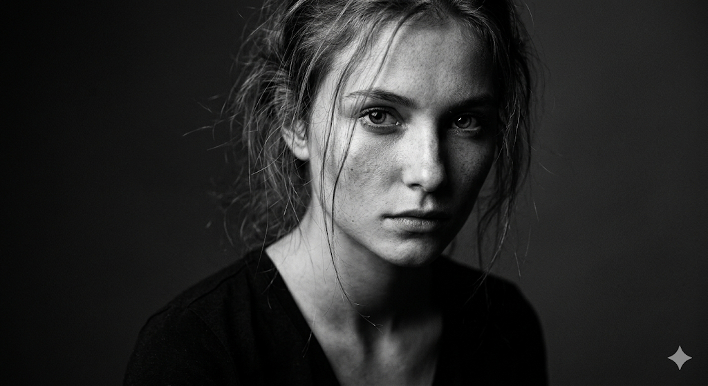 Скопируй внешность лица с загруженного референсного фото и примени к женщине с тонкими прядями волос, небрежно спадающими на лицо. Она смотрит прямо в объектив с глубоким, пронзительным выражением лица. Съемка проходит в темной студии с нейтральным фоном. Стиль черно-белой драматичной фэшн-фотографии подчеркивает фактуру кожи, поры и мелкие веснушки. Направленный боковой свет в технике кьяроскуро формирует глубокие черные тени и яркие белые блики на скулах, камера фокусируется строго на глазах с сильным размытием остальных черт, добавляя легкое пленочное зерно. black and white cinematic portrait, chiaroscuro lighting, dramatic directional side light, 85mm lens, f/1.4, high contrast, realistic skin texture, subtle film grain.