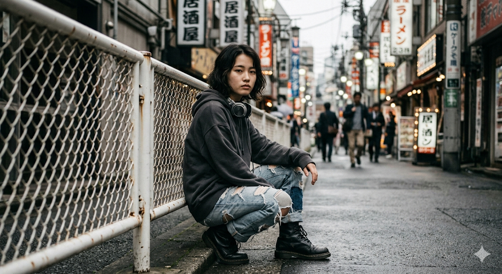 Скопируй внешность лица с загруженного референсного фото и примени к девушке с короткими волнистыми темными волосами, одетой в объемное серое худи, рваные синие джинсы, массивные черные ботинки и серебристые наушники на шее. Она сидит на корточках возле белого металлического ограждения с серьезным и нейтральным выражением лица. Локация представляет собой узкую урбанистическую улицу Японии с размытыми фигурами пешеходов и светящимися современными вывесками вдали. Стиль уличной документальной фотографии передает атмосферу мегаполиса. Мягкий рассеянный свет пасмурного дня создает приглушенную цветовую палитру с кинематографической тонокоррекцией, снято на широкоугольный объектив с красивым боке на заднем фоне. cinematic street photography, moody urban atmosphere, muted colors, overcast lighting, 35mm lens, f/1.8, bokeh background, film grain.