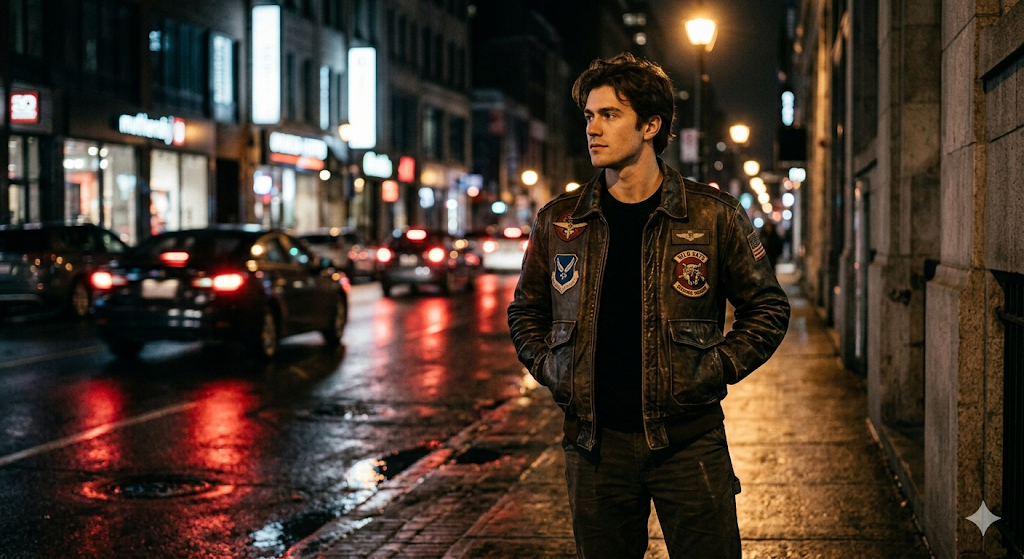 Скопируй внешность лица с загруженного референсного фото и примени к молодому мужчине со слегка взъерошенными темными волосами, одетому в коричневый кожаный бомбер с нашивками, черную футболку и темные брюки. Он уверенно стоит, засунув руки в карманы, и смотрит влево за пределы кадра. Сцена разворачивается на городском тротуаре ночью, где мокрый от дождя асфальт отражает красные огни фар и желтый свет уличных фонарей. Реалистичная ночная стрит-фотография передает динамику оживленного города с размытым потоком машин на фоне. Низкоключевое освещение выхватывает силуэт героя из темноты, камера находится на уровне глаз, фиксируя легкую зернистость ночной съемки. nighttime street photograph, low-key lighting, wet pavement reflections, blurred traffic lights, slightly grainy, realistic city glow, 50mm lens, cinematic night mood.