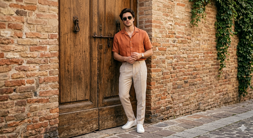 Скопируй внешность лица с загруженного референсного фото и примени к стильному мужчине с волнистыми волосами и аккуратной щетиной, одетому в терракотовую рубашку с коротким рукавом, бежевые плиссированные брюки, белые кеды и темные прямоугольные очки с тонкой золотой цепочкой на шее. Он непринужденно опирается спиной на массивную старую деревянную дверь на фоне кирпичной стены. Эстетика стиля тихой роскоши и летнего отдыха на Ривьере излучает элегантность и статус. Теплый естественный дневной свет мягко заливает сцену, подчеркивая текстуру ткани и дерева, камера снимает на уровне глаз с безупречной резкостью и кристально чистой цветопередачей. photorealistic, elegant old-money summer aesthetic, warm natural daylight, eye-level camera angle, ultra-sharp details, 85mm lens, high quality editorial, 8k resolution.