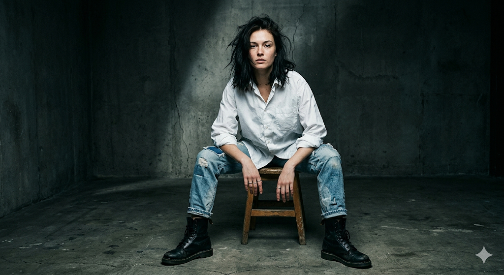 Скопируй внешность лица с загруженного референсного фото и примени к женщине с растрепанными волосами и минимальным макияжем, одетой в безразмерную белую рубашку, потертые синие джинсы и грубые черные ботинки. Она уверенно сидит на простом деревянном табурете, расставив ноги и положив руки на колени. Окружение состоит из голых бетонных стен темной индустриальной студии без декораций. Сырой и небрежный стиль портретной съемки ставит акцент на характере, а не на глянце. Жесткий боковой свет прорисовывает глубокие драматичные тени на бетоне и складках одежды, кадр сделан на пленочную камеру с выраженной текстурой зерна. raw style portrait, hard side lighting, dramatic shadows, dark concrete studio, Leica camera, 35mm lens, visible film grain, unretouched aesthetic.
