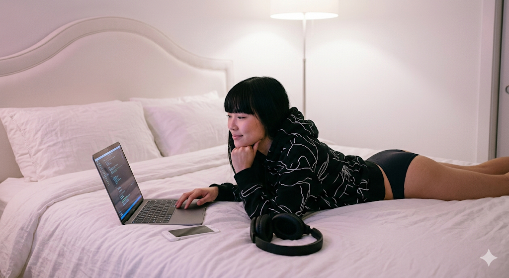 Скопируй внешность лица с загруженного референсного фото и примени к девушке с прямыми черными волосами и челкой, одетой в черную толстовку с белыми абстрактными линиями и темные плавки бикини. Она лежит на животе на белой кровати, положив правую руку на клавиатуру серебристого ноутбука, а левой подпирая подбородок, рядом лежат массивные черные наушники и белый смартфон. Локация представляет собой минималистичную спальню с белыми стенами и изогнутым изголовьем кровати. Уютная домашняя лайфстайл-фотография передает интимную атмосферу вечернего отдыха. Мягкий комнатный свет с легким пурпурным оттенком падает на лицо и простыни, камера снимает сверху под средним углом с умеренной глубиной резкости. contemporary lifestyle photography, medium shot from above, soft diffused indoor lighting, subtle pink tint, ISO 400, f/3.5, fine film grain, natural fabric folds.
