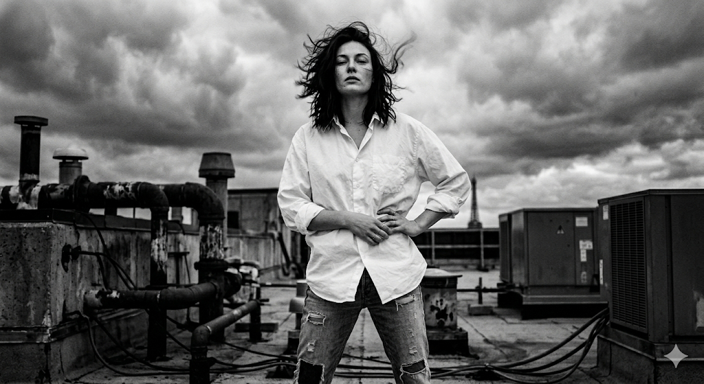 Скопируй внешность лица с загруженного референсного фото и примени к женщине в объемной белой мужской рубашке с закатанными рукавами. Она стоит в модельной позе надменно смотря на фотографа, пока сильный порыв ветра хаотично раздувает ее волосы и ткань одежды. Место действия — грязная индустриальная крыша с ржавыми трубами и вентиляционными шахтами под драматичным облачным небом. Стиль экспрессивной черно-белой модной фотографии ставит во главу угла эмоции и несовершенство момента. Мягкий направленный свет подчеркивает фактуру ткани, камера фиксирует легкий смаз от движения, добавляя кадру живой энергии и интенсивного пленочного зерна. Peter Lindbergh style, black and white fashion photograph, dynamic pose, movement blur, soft directional natural light, gritty industrial rooftop, raw imperfection, heavy film grain.