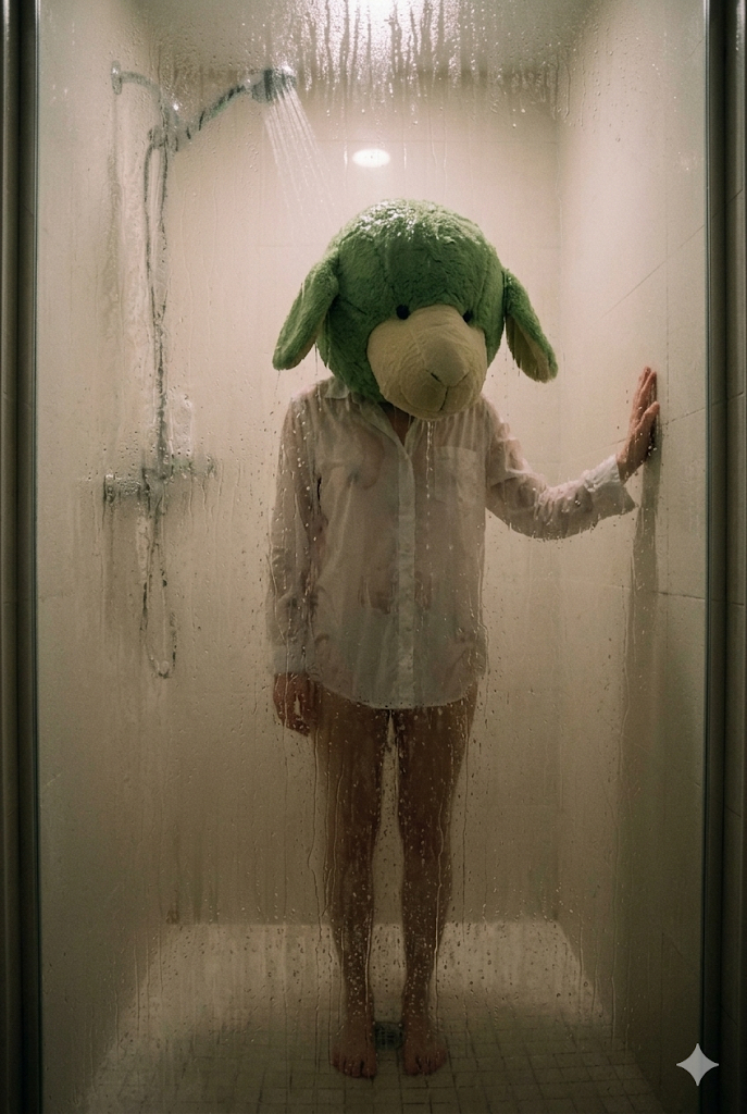 Скопируй внешность лица с загруженного референсного фото и примени к силуэту человека, чей образ едва проглядывает сквозь густой пар, пока он стоит под струями воды в душе, надев на голову гигантскую плюшевую маску зеленой овцы со светлой мордой (лица и волос не видно). Ладонью человек опирается на стенку душевой кабины. На тело надета белая рубашка, которая почти не видна за паром и запотевшим стеклом. Локация представляет собой ванную комнату, отделенную толстым стеклом, полностью покрытым каплями конденсата. Сюрреалистичная журнальная фотография вызывает чувство загадочности, мрачности и легкого абсурда. Вертикальное фото, в полный рост. Мрачный свет просвечивает сквозь пар, создавая кинематографичную дымку и мягкие пастельные оттенки, снято на широкий объектив с акцентом на текстуру мокрого стекла на переднем плане. surreal editorial photo, fogged-up glass shower, condensation, warm soft lighting, cinematic atmosphere, 35mm lens, wide framing, pastel hues, dreamy realism.