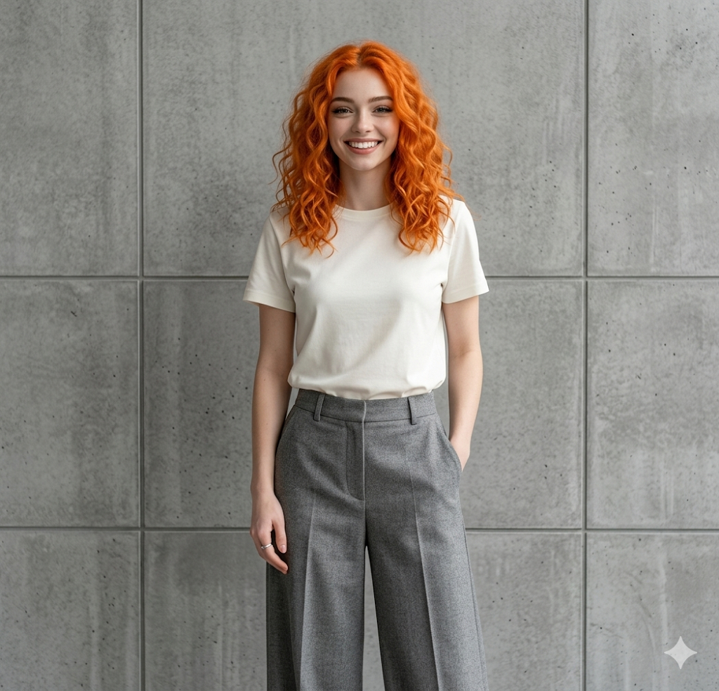 Скопируй внешность лица с загруженного референсного фото и примени к человеку, одетому в безупречно гладкую футболку цвета слоновой кости и ультрамодные широкие брюки. Он расслабленно стоит, засунув руки в карманы брюк, с легкой уверенной улыбкой на губах. В качестве фона выступает массивная стена из крупной серой бетонной плитки, задающая строгий урбанистический тон. Минималистичный стиль стритвир-лукбука фокусируется на чистоте линий и геометрии одежды. Мягкий ровный свет, имитирующий студийное освещение на улице, устраняет резкие тени, камера снимает фронтально с идеальной резкостью текстур ткани и бетона. minimalist streetwear editorial, fashion-forward, gray concrete tiles, soft studio-like lighting, raw urban atmosphere, ultra-detailed fabric, 50mm lens, photorealistic.