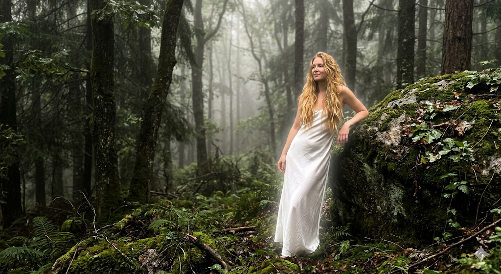 Скопируй внешность лица с загруженного референсного фото и примени к женщине с распущенными золотистыми волосами, одетой в струящееся платье из белого шелка, которое излучает слабое магическое свечение. Она непринужденно опирается на поросший густым мхом валун посреди темного влажного леса. Сказочная и таинственная атмосфера подчеркивается плотным белым туманом, стелющимся между массивными стволами деревьев. Приглушенный дневной свет пробивается сквозь густую листву, создавая блики на мокрых листьях, кадр стилизован под любительскую съемку на смартфон с легкой расфокусировкой и мягким контрастом. ethereal glowing effect, dark green forest, heavy thin white fog, spontaneous iPhone photography perspective, soft focus, light haze, warm diffuse shadows, photorealistic magic.