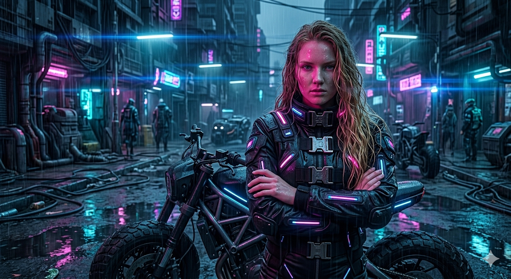 Скопируй внешность лица с загруженного референсного фото и примени к девушке в высокотехнологичной черной куртке с неоновыми вставками и массивными металлическими застежками. Она облокотилась на футуристический мотоцикл с широкими колесами, скрестив руки на груди и вызывающе глядя в камеру. Сцена происходит на грязной улице киберпанк-города под проливным дождем, где лужи отражают яркие вывески. Эстетика мрачного научно-фантастического будущего изобилует деталями проводов, мокрого металла и синтетических тканей. Контрастное освещение формируется за счет холодного синего света улиц и ярких розовых неоновых бликов на мокром лице, снято на анаморфотный объектив с характерными горизонтальными бликами. cyberpunk aesthetic, neon-lit street, heavy rain, futuristic tech-wear, high contrast cinematic lighting, pink and blue neon glow, anamorphic lens flare, 8k resolution, hyper-detailed wet surfaces.