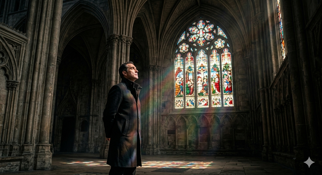 Скопируй внешность лица с загруженного референсного фото и примени к мужчине в строгом черном приталенном пальто из плотной шерсти с поднятым воротником. Он неподвижно стоит возле колоссального витражного окна, сложив руки за спиной и глядя вверх на своды. Локация представляет собой интерьер мрачного готического собора с массивными каменными колоннами и резными арками, скрытыми в полумраке. Атмосфера величия и мистики пронизывает каждый элемент кадра. Единственный источник света — это яркие разноцветные лучи солнца, проходящие сквозь витраж и рисующие геометрические узоры на каменном полу и лице героя, в воздухе видна густая пыль, снято с кинематографическим контрастом. dark gothic cathedral interior, stained glass window light, volumetric light rays, dark moody atmosphere, cinematic contrast, 50mm lens, highly detailed stone textures, masterpiece.