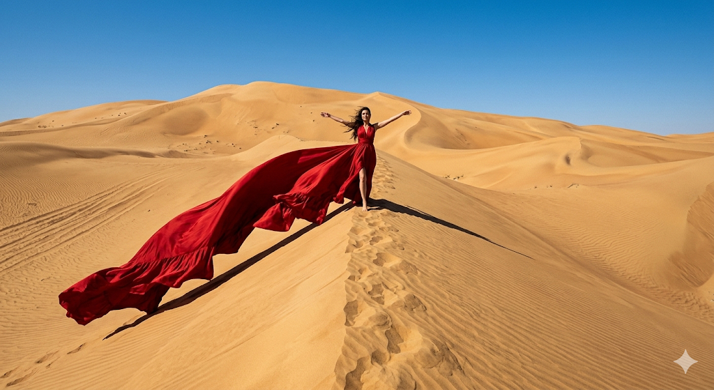 Скопируй внешность лица с загруженного референсного фото и примени к женщине в гигантском струящемся платье из красного шелка, длинный шлейф которого развевается на ветру. Она величественно шагает по гребню высокой песчаной дюны, раскинув руки в стороны. Место действия — бескрайняя знойная пустыня с идеальными волнами песка под палящим полуденным солнцем и безоблачным голубым небом. Стиль эпичной высокой моды играет на масштабном контрасте маленькой фигуры и огромного пейзажа. Жесткий зенитный свет создает глубокие черные тени в складках красной ткани и подчеркивает песчаную рябь, камера снимает с широким углом обзора и невероятной резкостью. epic high-fashion editorial, vast sand dunes, flowing red silk dress, harsh midday sun, deep shadows, wide-angle 24mm lens, highly detailed sand texture, ultra-realistic 8k.