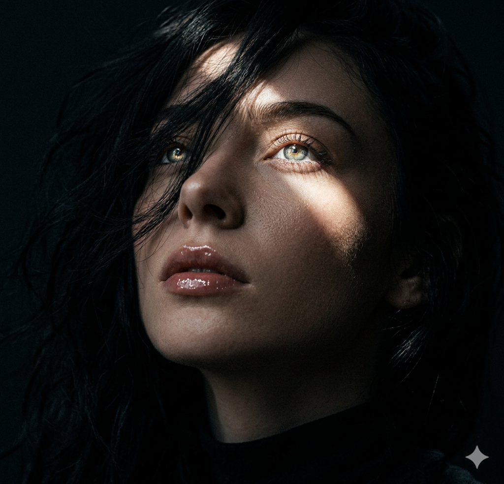 Скопируй внешность лица с загруженного референсного фото и примени к женщине с растрепанными ветром черными волосами, частично закрывающими один глаз, и глянцевым блеском на губах. Она слегка приподняла подбородок, устремив пронзительный взгляд вверх. Окружающее пространство полностью поглощено глубокой темнотой, оставляя фокус исключительно на объекте. Эстетика мрачного кинематографического портрета для обложки журнала строится на технике кьяроскуро. Резкий диагональный луч естественного света прорезает темноту, освещая только светлую радужку глаз и высокие скулы, оставляя остальную часть лица и шеи в густых черных тенях. 8k resolution, ultrarealistic close-up shot, sharp diagonal natural light beam, chiaroscuro, deep shadows, dark cinematic editorial mood, 85mm lens, f/1.8, highly detailed skin texture, glossy lips.