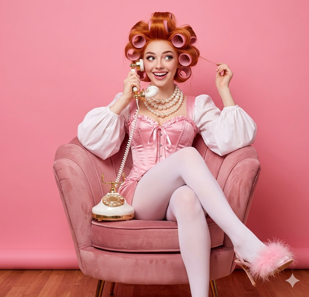 Скопируй внешность лица с загруженного референсного фото и примени к женщине с объемными локонами, накрученными на крупные розовые бигуди, с массивным жемчужным ожерельем на шее. Она одета в розовый атласный корсет поверх белой блузки с пышными рукавами, белые плотные колготки и туфли на каблуке, украшенные розовыми перьями. Она сидит на пудрово-розовом бархатном кресле, откинувшись назад и закинув ногу на ногу, держа у уха винтажный бело-золотой дисковый телефон с игривым и удивленным выражением лица. Сцена разворачивается в студии на фоне сплошной ярко-розовой стены. Эстетика глянцевой журнальной фотографии шестидесятых годов передает кукольную, гротескную ретро-атмосферу. Мягкий теплый фронтальный свет равномерно освещает фигуру, сглаживая тени и подчеркивая фактуру тканей, камера снимает в полный рост с легкого нижнего ракурса. Barbiecore aesthetic, 1960s retro-glamour, glossy fashion editorial style, bright solid pink background, soft warm front light, full-body shot, low angle, 50mm lens, ultra-realistic, vivid pastel colors, highly detailed velvet and satin textures.