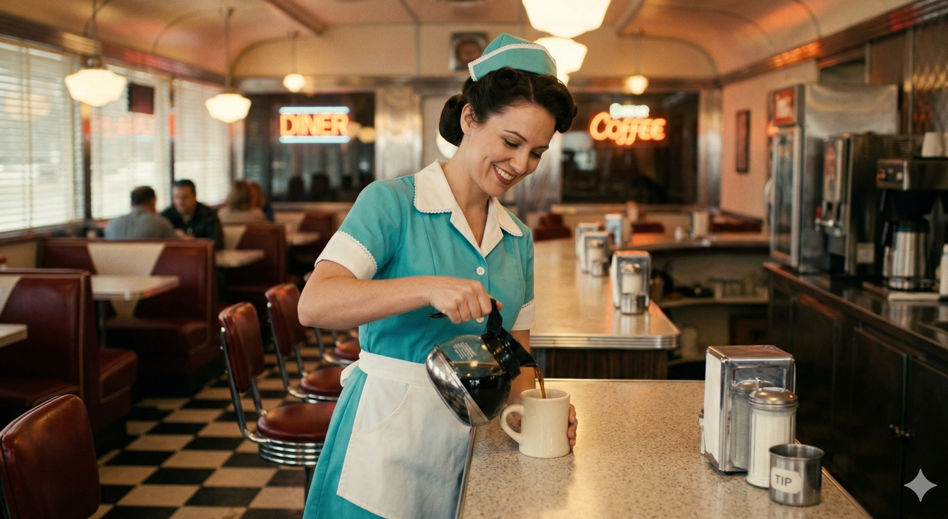 Классическая американская эстетика с теплым цветокором. Хромированные детали, винтажная униформа и уютная атмосфера придорожного кафе.