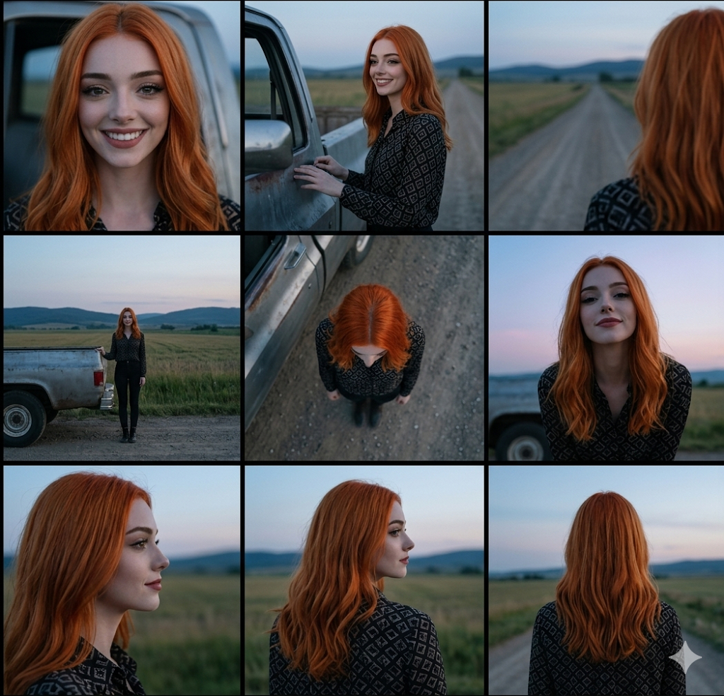 Скопируй внешность лица с загруженного референсного фото и примени к молодой женщине в черной рубашке с геометрическим узором. Она стоит возле металлического кузова автомобиля на пустынной проселочной дороге, окруженной открытыми полями и далекими холмами. Изображение разделено на ровную сетку три на три кадра, где каждый сегмент демонстрирует уникальный ракурс героини: экстремально крупный план, средний план, вид из-за плеча, общий план, вид сверху, нижний ракурс, профиль, вид сзади в три четверти и вид со спины. Эстетика профессионального кинематографического референс-листа передает атмосферу вечернего роуд-муви с абсолютной идентичностью внешности во всех девяти кадрах. Естественный свет синего часа создает мягкие градиенты на небе и реалистичные приглушенные цвета, камера снимает с малой глубиной резкости. cinematic 3x3 grid collage, multiple camera angles, professional cinematography reference sheet, film-still aesthetic, natural blue-hour lighting, soft sky gradients, shallow depth of field, 35mm lens, ultra-realistic photography, identical character consistency.