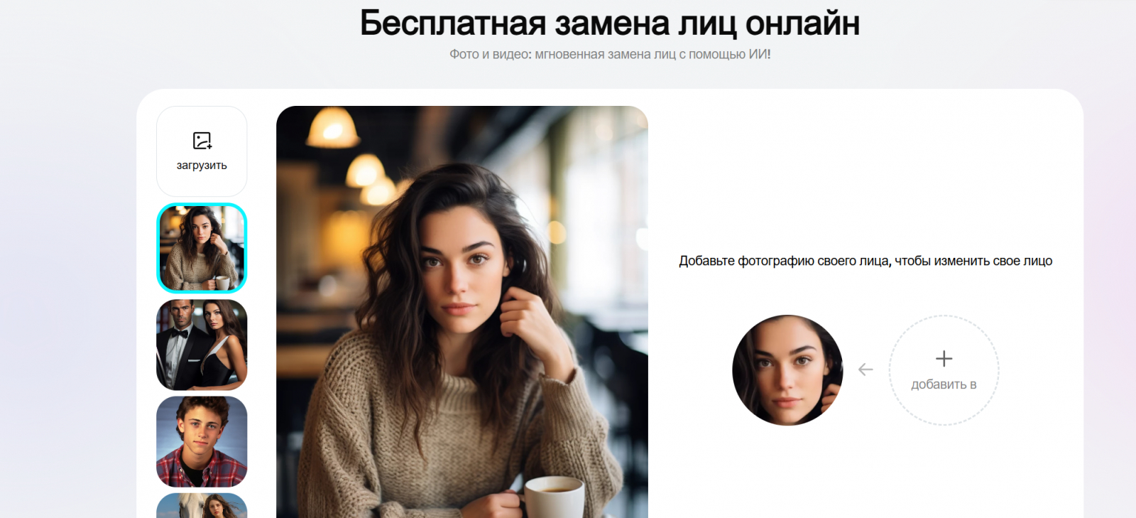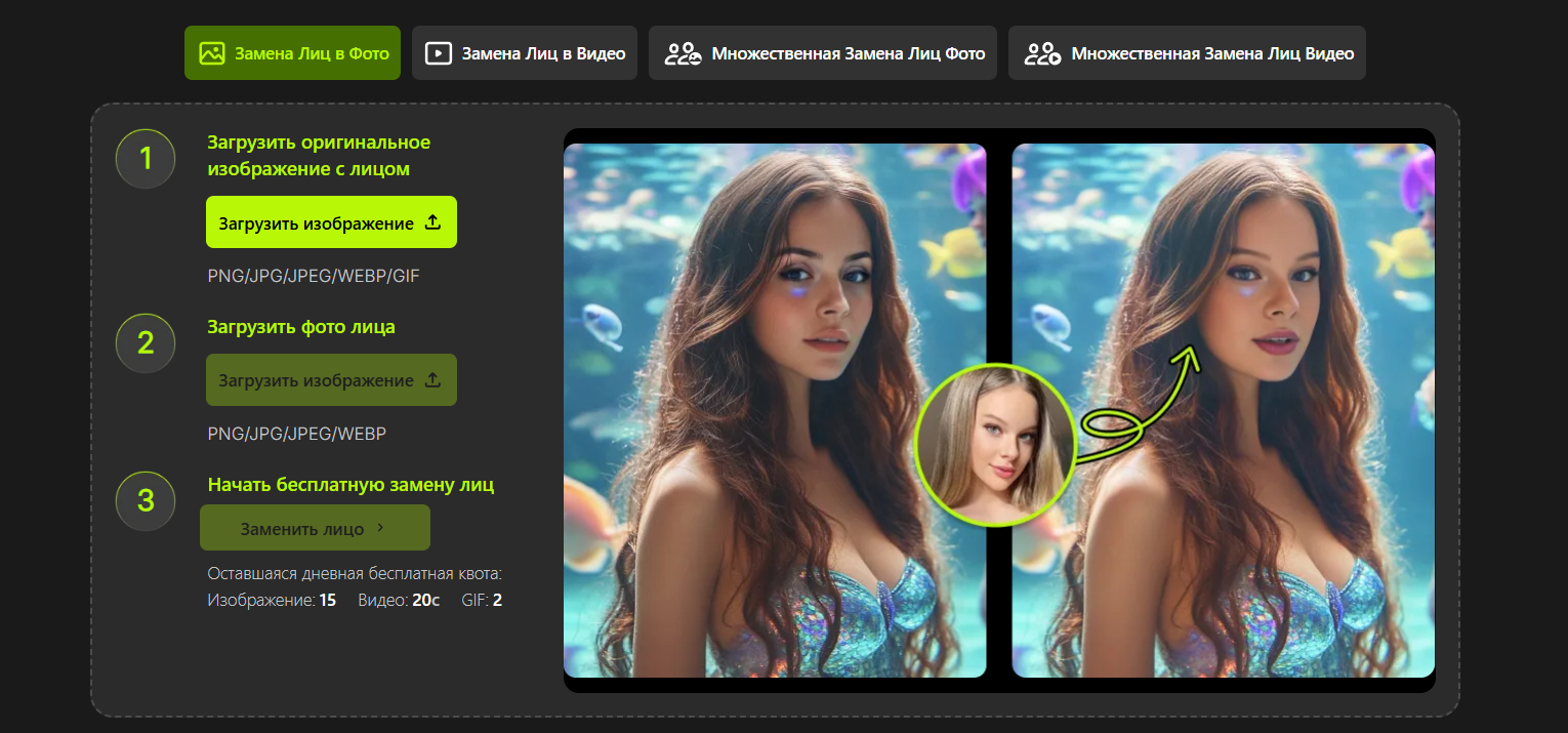 Популярный сервис, специализирующийся на развлекательном контенте и быстрой, эффектной трансформации внешности. Если вас интересует качественная замена лица на фото всего в пару кликов, эта платформа точно стоит вашего внимания. Алгоритмы изначально заточены под максимальную простоту и эффектный визуальный результат.