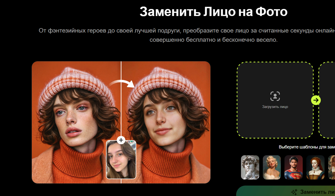 Специализированный портал, название которого говорит само за себя. Если вы ищете, как сделать замену лица на фото без лишних заморочек, этот сайт предоставит весь необходимый функционал. Нейронка обучена на миллионах портретов, что позволяет ей безошибочно определять ключевые анатомические точки.