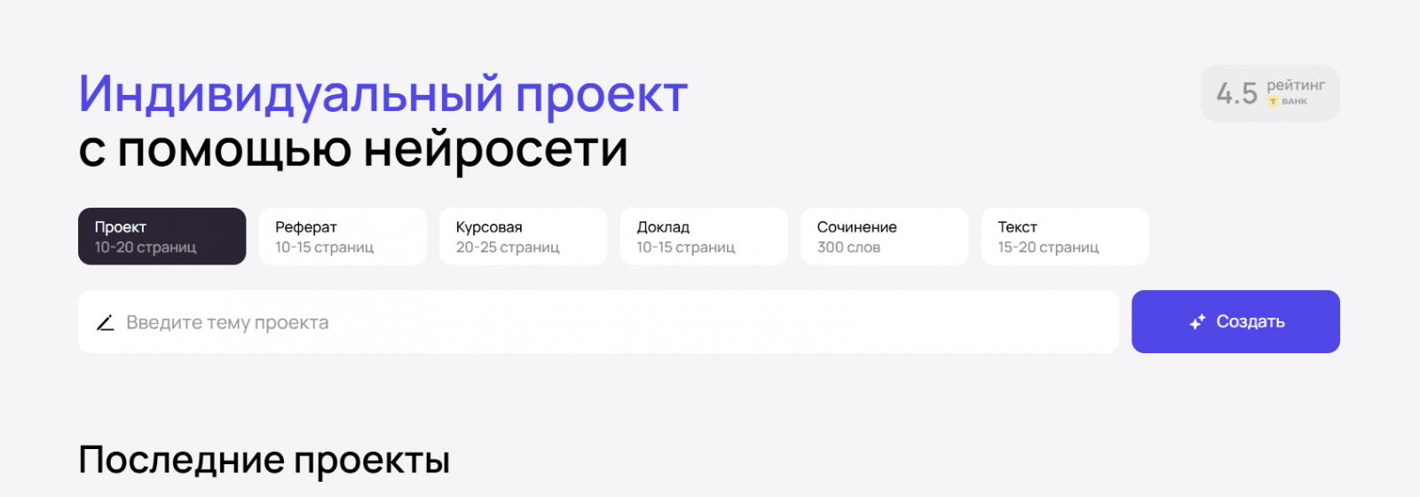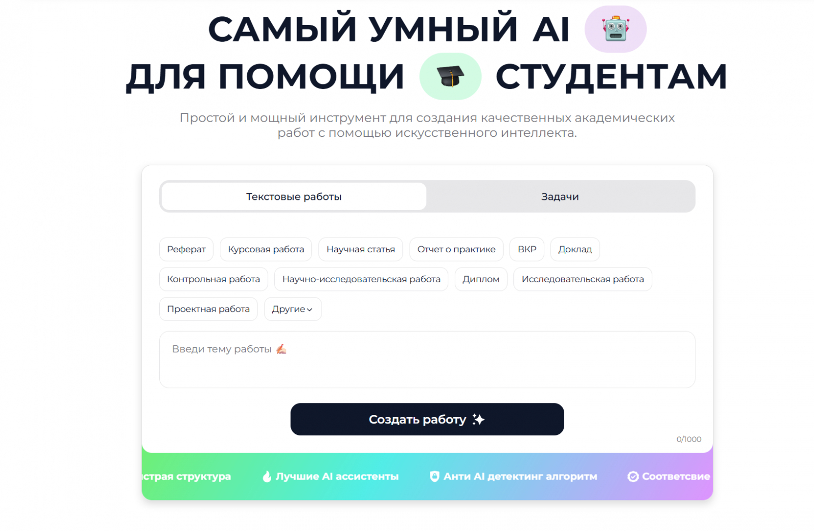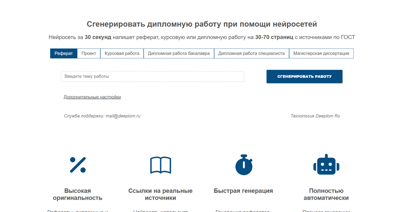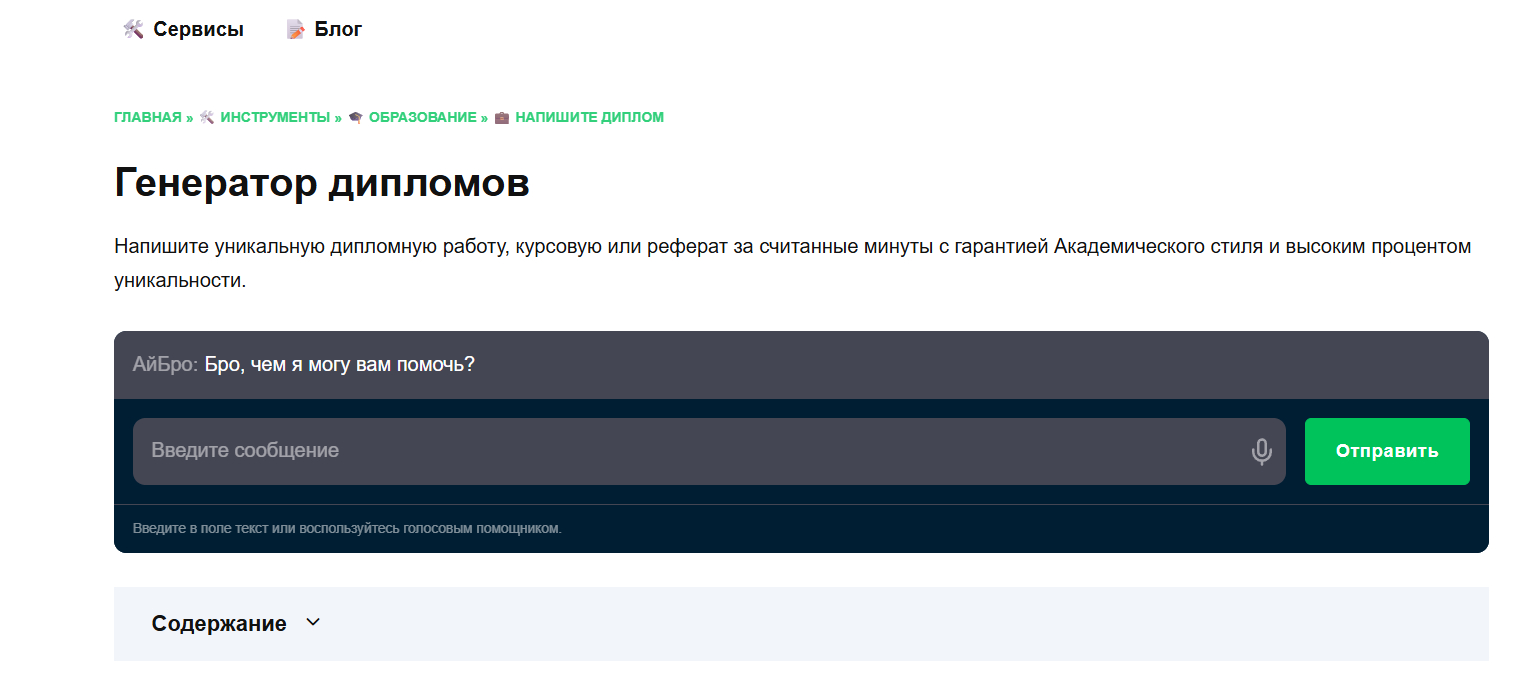 Профильный отечественный сервис, заточенный исключительно под академические тексты и исследовательские эссе. Интерфейс интуитивно понятен, поэтому проектирование структуры будущего исследования занимает считанные минуты. Это надежная нейросеть для генерации дипломной работы, которая берет на себя самую нудную часть процесса — сбор черновика и первичную компиляцию теоретических данных.