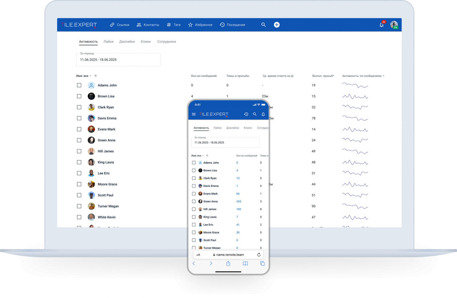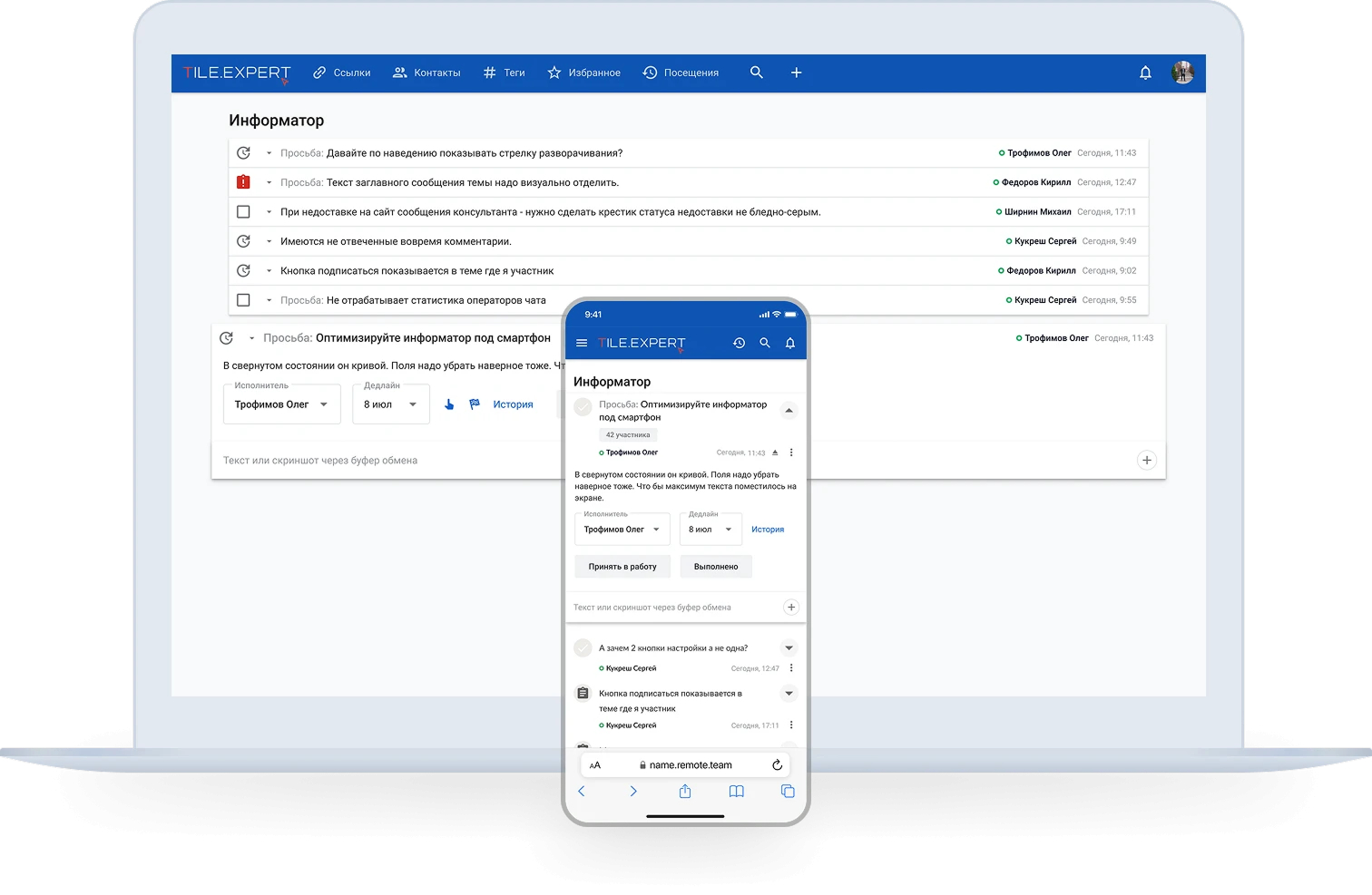 Remote.Team имеет адаптивный интерфейс и работает в любом браузере на любом устройстве от настольного компьютера до смартфона. Установка приложений не требуется.
