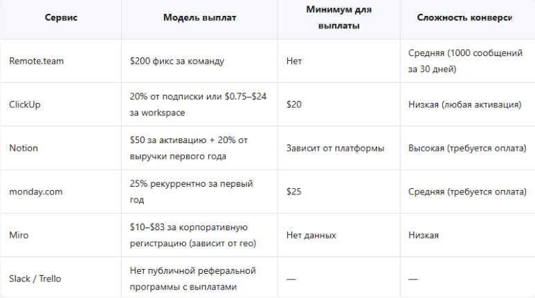 Рефералка SaaS подходит, если вы уже взаимодействуете с аудиторией, которой нужны инструменты для командной работы. Remote.team предлагает предсказуемую выплату $200 без минимального порога вывода, это проще для старта, чем процентные модели. Конкуренты платят меньше за единичную конверсию, но могут давать рекуррентный доход (20–25% от подписки год). Выбор зависит от вашей аудитории.