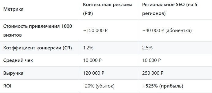 Экономика регионального продвижения представляет собой комплексное аналитическое направление, позволяющее оценить рентабельность вложений и оптимизировать маркетинговые бюджеты с учетом особенностей локальных рынков. В условиях высокой конкуренции в сегменте регионального бизнеса, грамотное управление затратами и правильное определение ROI становится ключевым фактором устойчивого роста. Региональное SEO обеспечивает накопительный эффект. Пока контекстная реклама работает «здесь и сейчас» (как только выключили бюджет — трафик пропал), SEO-позиции по регионам продолжают генерировать лиды 24/7, постепенно снижая стоимость привлечения одного клиента до символических величин.