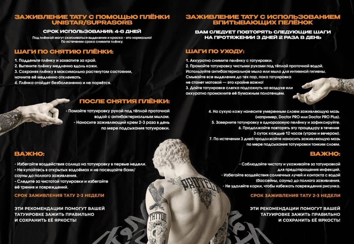 Ухаживать за татуировкой в первые часы особенно важно, потому что именно в первые дни формируется верхний защитный слой кожи. Участок промывают 2–4 раза, наносят средство тонким слоем и избегают перегрева.