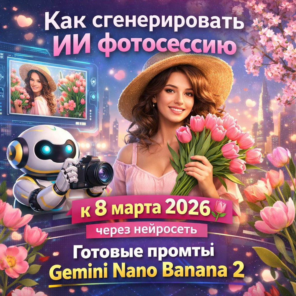 Gemini Nano Banana 2 от Google вышла в феврале 2026 и сочетает скорость Gemini Flash с качеством Pro-версии. Она генерирует фотореалистичные портреты, сохраняет черты лица из загруженного фото, добавляет текст и даже инфографику с цветами - идеально для Международного женского дня.