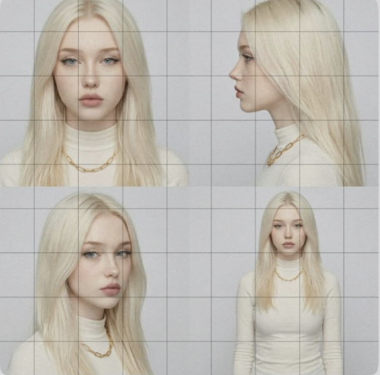 Using the person in this reference photo, generate a single square image containing a 2x2 character reference sheet (4 cells in one image): Top-left: FRONT VIEW (face straight at camera, neutral expression). Top-right: SIDE PROFILE (90° left profile view. Bottom-left: THREE-QUARTER VIEW (3/4 angle, slightly turned). Bottom-right: FULL BODY (head to toe, same person, same clothing). CRITICAL RULES: - Keep the EXACT same person: same face shape, hair color/style, skin tone, clothing, body proportions. - Each cell should have a clean, simple background (light gray or white). - Professional character sheet layout — clear separation between cells. - Realistic photographic style — looks like real studio photography. - Natural skin textures, real lighting, no cartoon/illustration effects. - Square output (1:1 aspect ratio). - High quality, detailed rendering. - Do NOT add any text labels, captions, or titles on the image. Output exactly ONE square image.