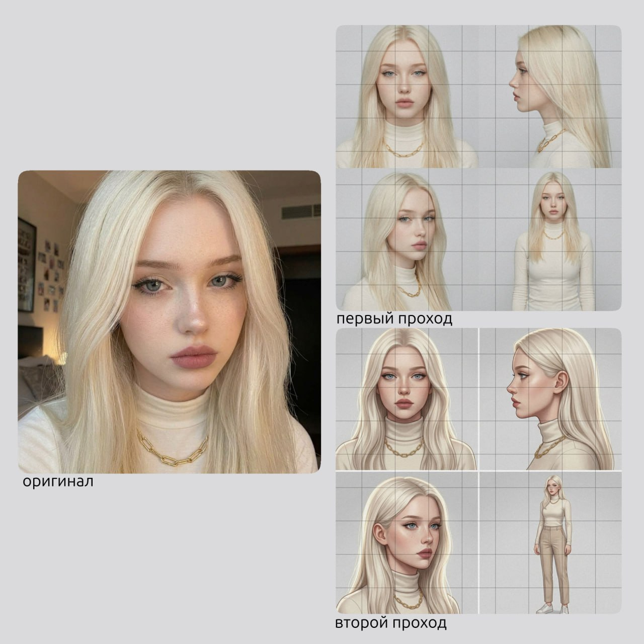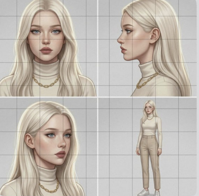 В общем, вы должны взять своё фото и создать из него в Nano Banano 2 несколько ракурсов персонажа на одной картинке.