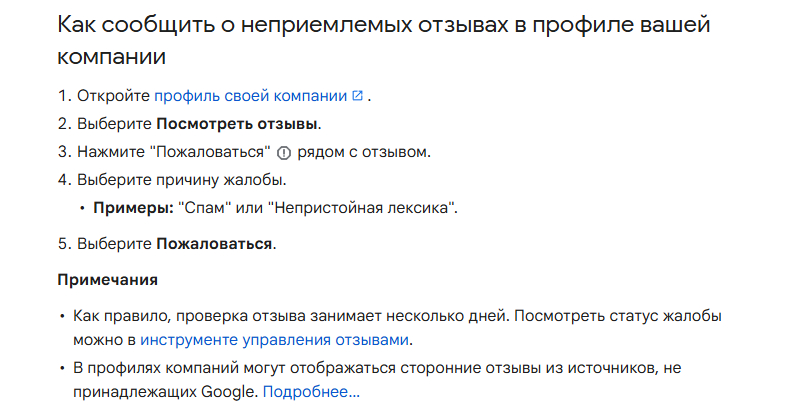Что работает? Можно сообщить о неприемлемых отзывах в профиле вашей компании. Пожаловаться можно на любой отзыв, но удаляют только те, в которых нарушены правила Google. Отметка о конфликте интересов. Если автор отзыва — ваш бывший сотрудник или конкурент, вы можете пожаловаться, выбрав причину «Конфликт интересов». Google иногда удаляет такие отзывы, но процесс может занять месяцы.