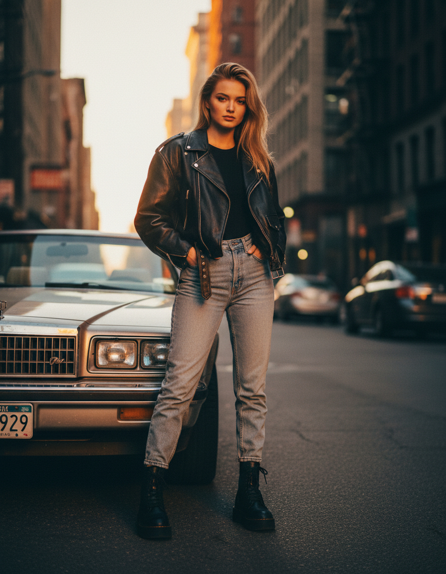 Промт 2 — street-style:Городская фотосессия девушки на улице, золотой час, тёплый свет, стиль casual, естественные позы, 35mm, кинематографичный цвет, фотореализм, высокая детализация