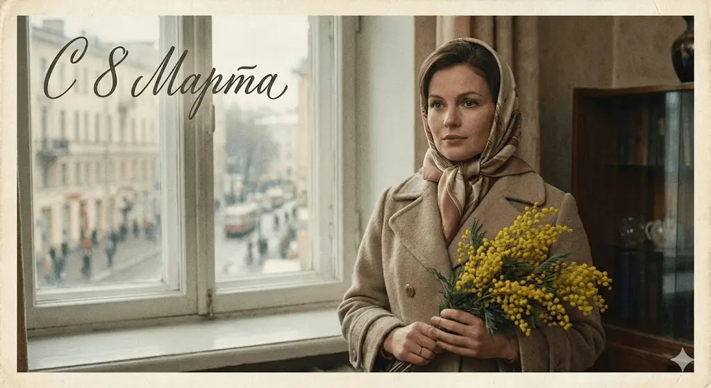 Открытка на 8 марта с использованием загруженного фото, сохранить лицо без изменений, стиль советского кино 1970-х, мягкий плёночный эффект, естественный свет, спокойная элегантность, кинематографичная композиция, винтажная цветокоррекция, надпись «С 8 Марта»